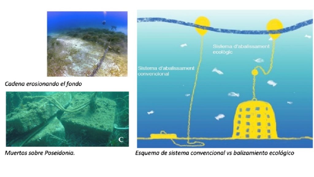 El sistema de balizamiento ecológico se puede aplicar tanto a la separación de zonas con diferentes usos, como a la señalización de las zonas de fondeo, mediante el uso de biotopos claramente marcados por boyas que indican los puntos de anclaje permitidos